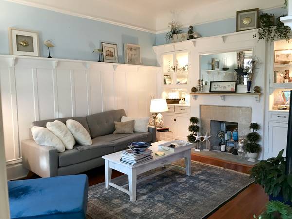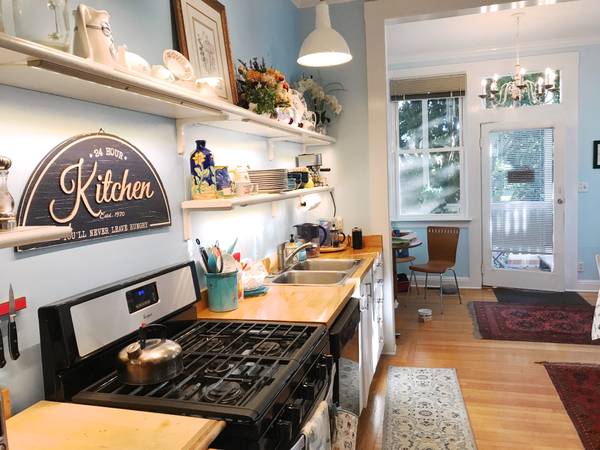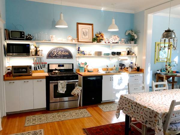 The Kitchen is equipped with a dishwasher, toaster oven and microwave. Hardwood floors, and lots of natural light. Tastefully furnished throughout.