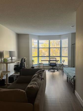 There’s a queen bed, roomy work desk, full kitchen, and big windows with lots of light.