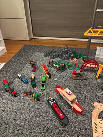 Huge collection of Brio! Full bin of brio (and ikea tracks). A bunch of Brio trains. A bunch of Brio sets: Lift and Load Warehouse set; Construction Crane; Cargo Harbour set; Cargo Railway Deluxe set; Classic Figure 8 set; Ferry Ship; Clever Crane Wagon (links below).