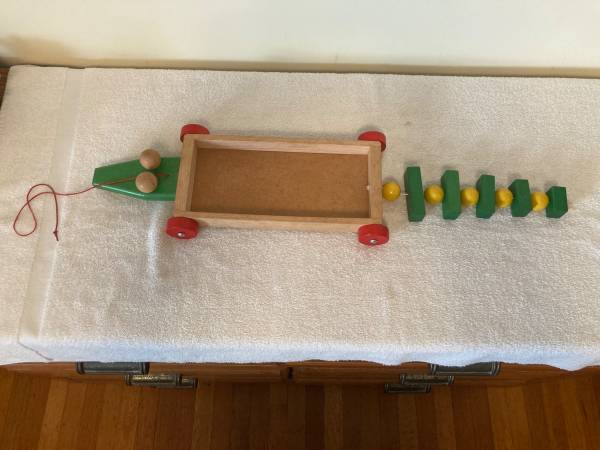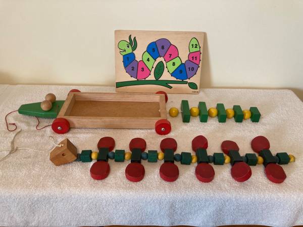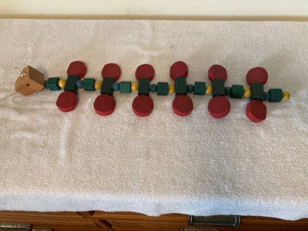Vintage Wooden Crocodile Pull Toy, measures 28" long - $10 Vintage Wooden Centipede Pull Toy, Measures 23" long - $10 Wooden Centipede Puzzle - $7 Cash only