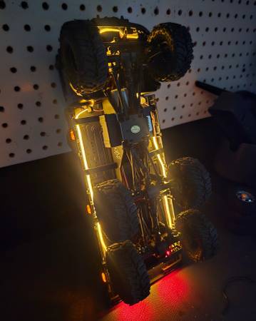 The wheels are upgraded to eight 1-inch brass wheels with DJC 68×26mm tires and purple silicone inserts. I used the winch to hold the other two wheels on the bed. I also added an underbody LED strip that works with the remote light switch.