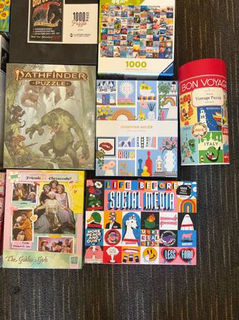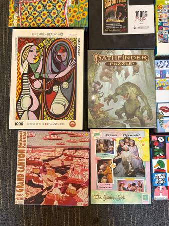 1000 piece puzzles- $5 The Jonathan Adler, Ravensburger 99 Ocean Scenes, and Vintage Travel puzzles have been sold. The Golden Gate Bridge puzzle is free because it has a few pieces missing. The...