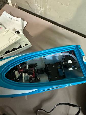This is a high-speed remote-controlled boat that goes 20= mph with a 4-channel remote with 120-meter signal range. The remote has a smart 2.4 GHZ LCD display showing signal, power, trim adjustment, Left-Right throttle switch mode, emergency stop function and low single warning to avoid the boat going out of range. Water-cooled engine that uses freshwater lake, river or pool water to cool the engine while racing. The double-hatch design protects your RC boat and improves water resistance in wavier waters. Playing Time is 15 minutes and Charging Time is 3-4 hours. Included in Box: Velocity Boat, 7.4V 1100mAh Li-ion Rechargeable Boat Battery, 2.4Hz Remote Transmitter (4 AA Batteries needed), USB Charging Cable, Spare Propeller and Nosie Guard.