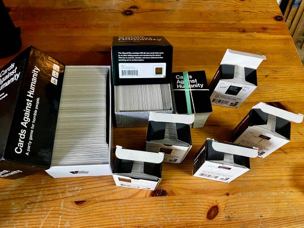 We have a lot of cards against humanity cards to give away. They're all mixed together but: Regular box Absurd Box Expansions 1 through 5 A bunch of small one offs (80s is the only one I...