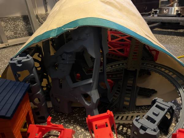 Much-loved Thomas & Friends Train Set. It appears this set is no longer available, but it is a mining theme with slides for the quarried "stones," buildings, and supports for raised tracks. Includes the train, remote, buildings and lots of track pieces. Not in original package, but in a cute storage tote.