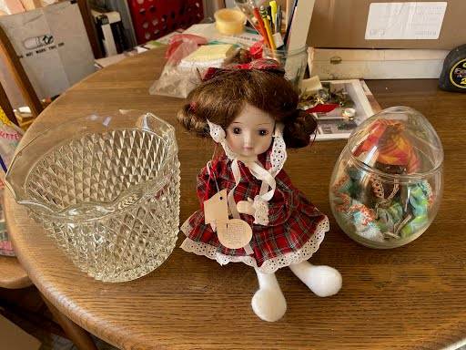 1. Crystal Jar 8" tall $20 Musical Collectible Doll from Schmid 8" tall $20. African Handcraft Doll in the jar 8" tall $20. 1983 Graduation Bear Doll 7" tall $20. 2. Lot of Amusement Dolls (3), $30...
