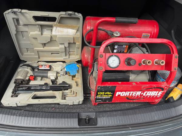 Complete compressed air nailing set for driving framing and finish nails. Porter Cable 3 hp, 135 max PSI, 2 tank 4 gallon capacity compressor. Hitachi oil-less framing nailer with 3.5 inch long nail capacity. Includes 2 boxes of galvanized nails. Porter Cable 15 gauge finish nailer with 2.5 inch capacity. Includes nails and lubricating oil. Set includes air hose with fittings.