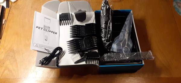 New grooming kit good for dogs or cats of any size It comes in its box with all the accessories Rechargeable, cordless when using it and it can also be used while charging
