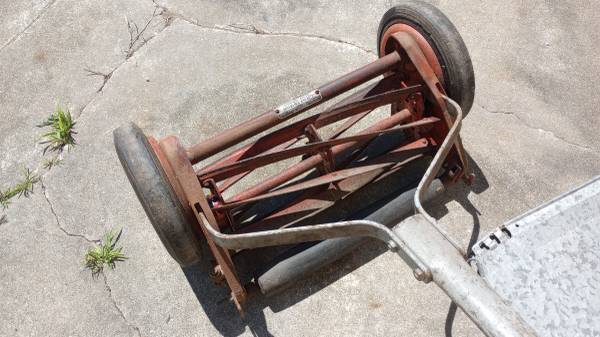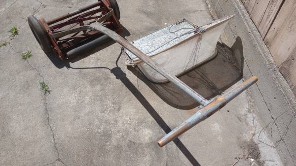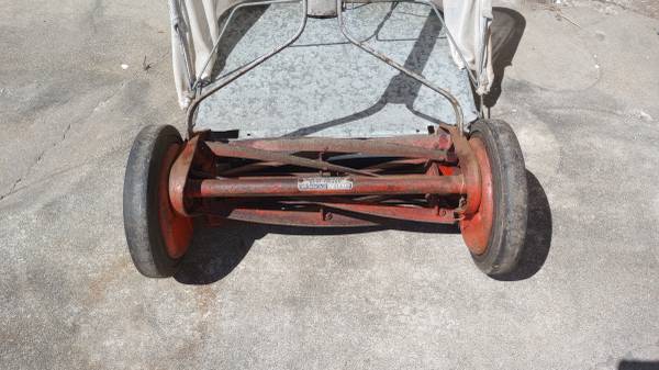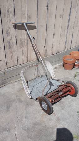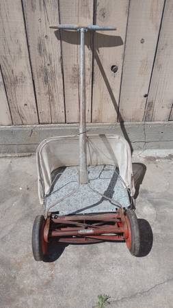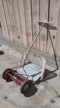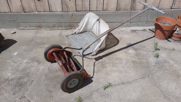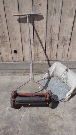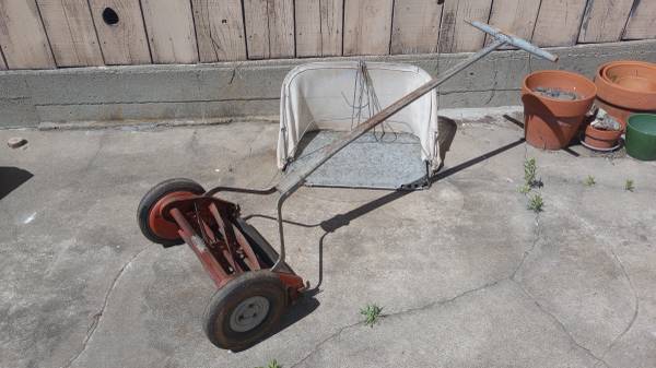 Vintage Sears Craftsman lawn mower made in USA. Includes basket. Operates smoothly and works well