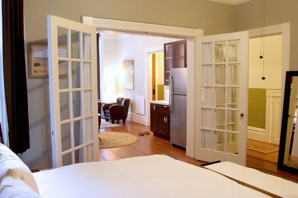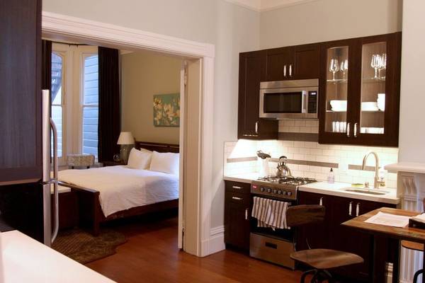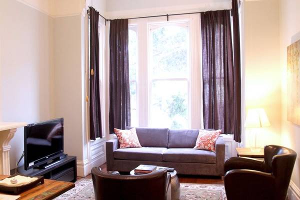 RENT CONTROLLED -- Truly gorgeous, rent-controlled apartment available February 15th. Divisadero and Haight. Amazing neighborhood. This apartment is a beautiful classic Victorian era one bedroom with a newly renovated with a modern kitchen. It has amazing 13 foot high ceilings with original 130 year old crown molding and original hardwood floors throughout. The large (750 sq foot) open floor plan has French doors between the living room and bedroom with a well laid out pass-through kitchen. With 7 foot tall south facing windows it really feels grand. The bedroom is very large and the bathroom is small with a standing shower. Great closet spaces. There are on-site, free double washers and dryers as well as a locked bike shed. Access to a gorgeous and bucolic backyard with lots of seating, firepit, gas and wood pellet grill, outdoor wet bar, shared refrigerator and fruit trees. Cats considered. No dogs and no smoking.