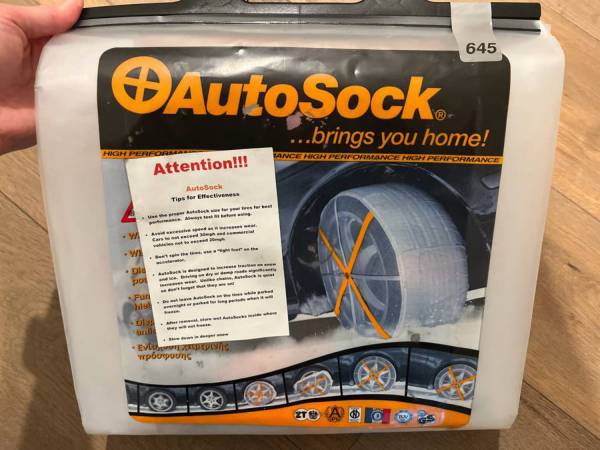 Brand new, never opened Retail price $120.95 plus tax Autosock tire socks traction aid Meets CalTrans requirements for chain control in Tahoe.