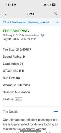 Normally over $300 apiece with tax (see Costco price), I’m offering one or all at the listed price (per tire). I changed to a full set of different model tires.