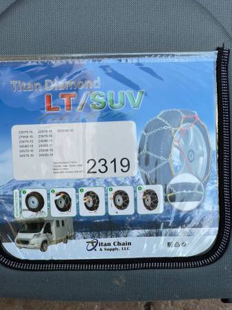Like-new tire chains - never used. Purchased from etrailer.com in September 2024 for $134 (includes tax). Titan Chain Alloy Snow Tire Chains - Diamond Pattern - Square Link - 1 Pair. Part Number:...
