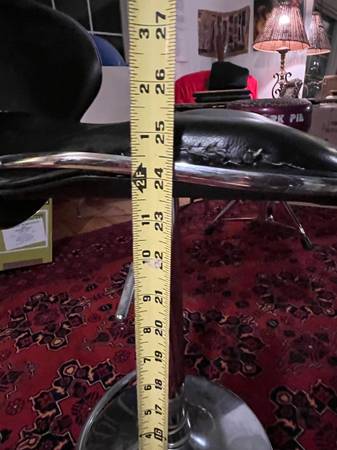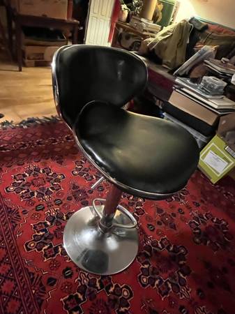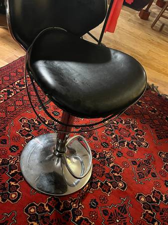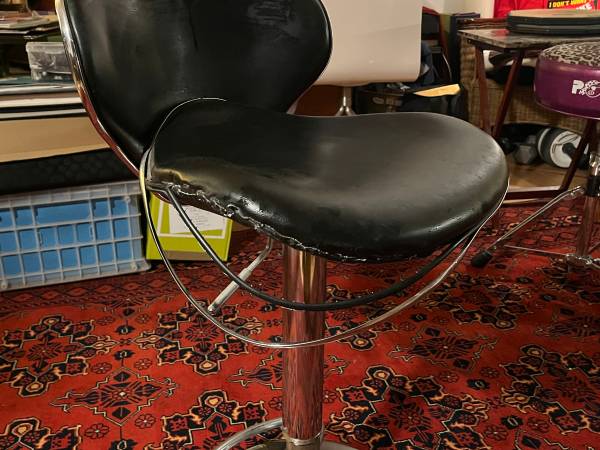Bar stool - damaged trim; have taped up (not shown), fully functional vertically, lower foot ring wonky. I've been using as a table for my computer cables, but reorganized.