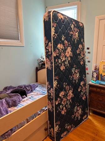 Very clean twin mattress. We bought a bed that was in someone’s guest room, probably never slept on. No smoking or pets there. We have cats. My kid preferred their mattress, so passing this one...